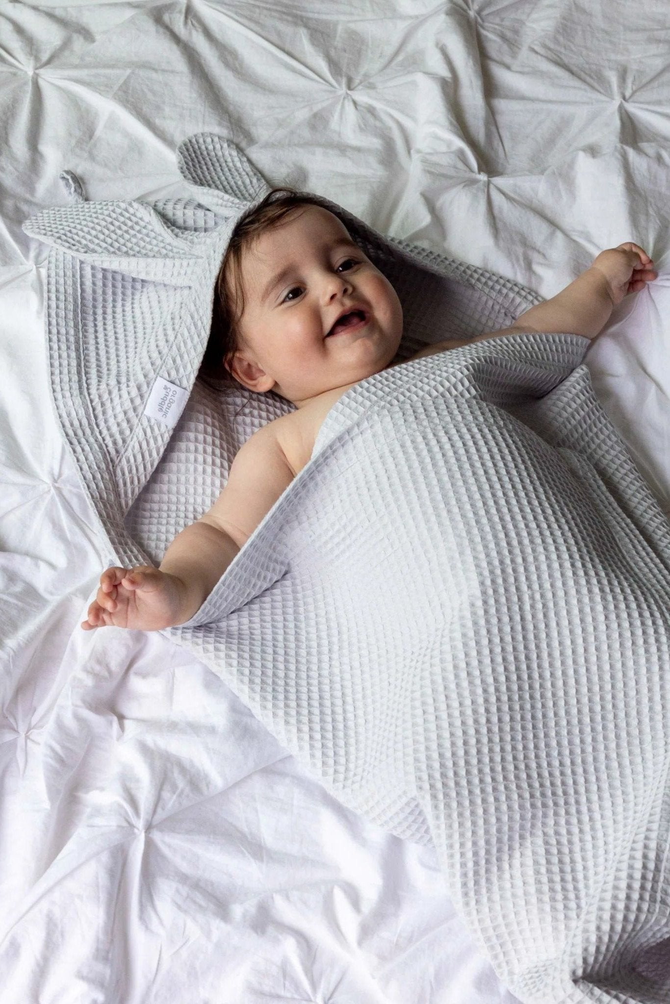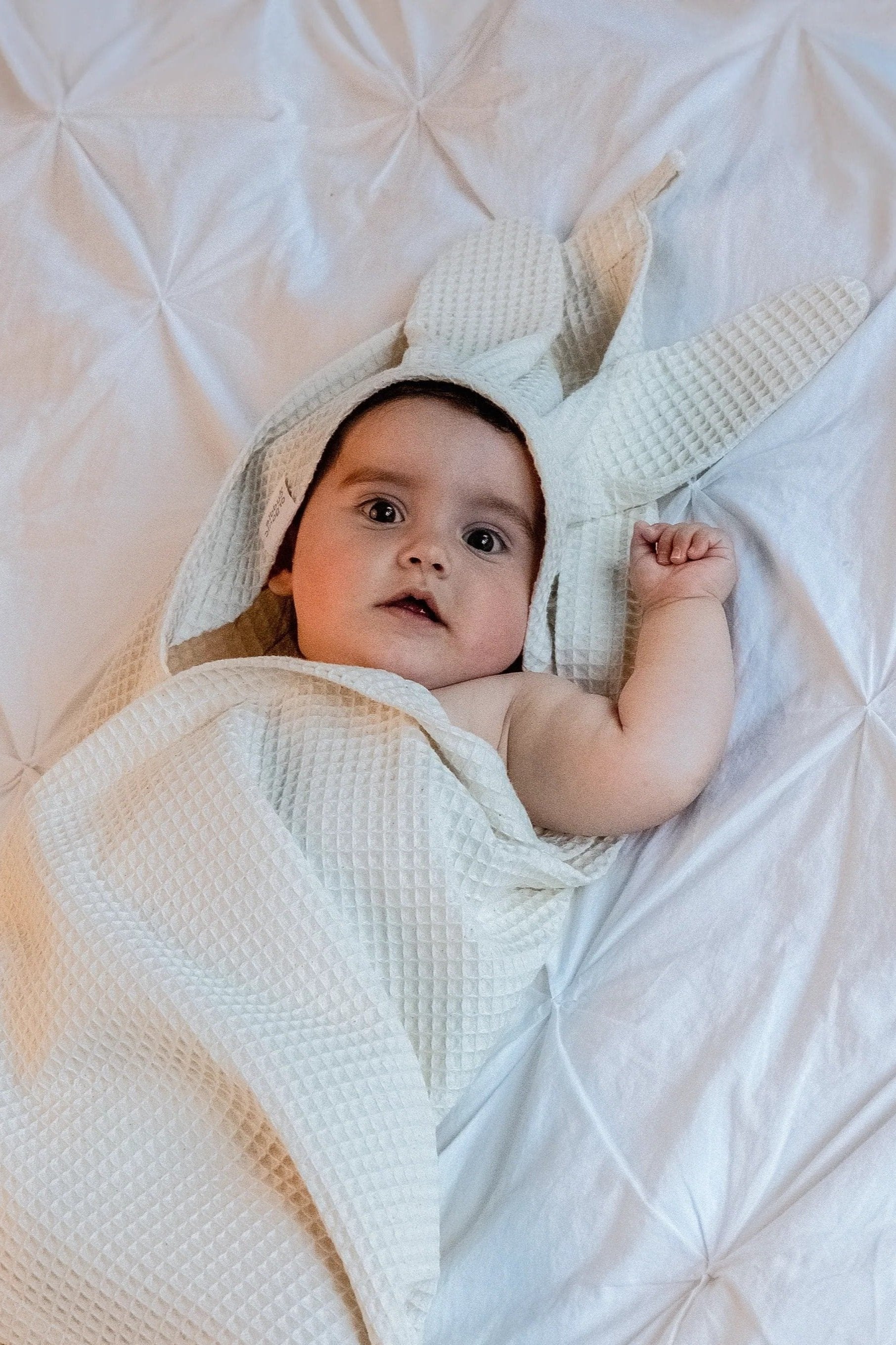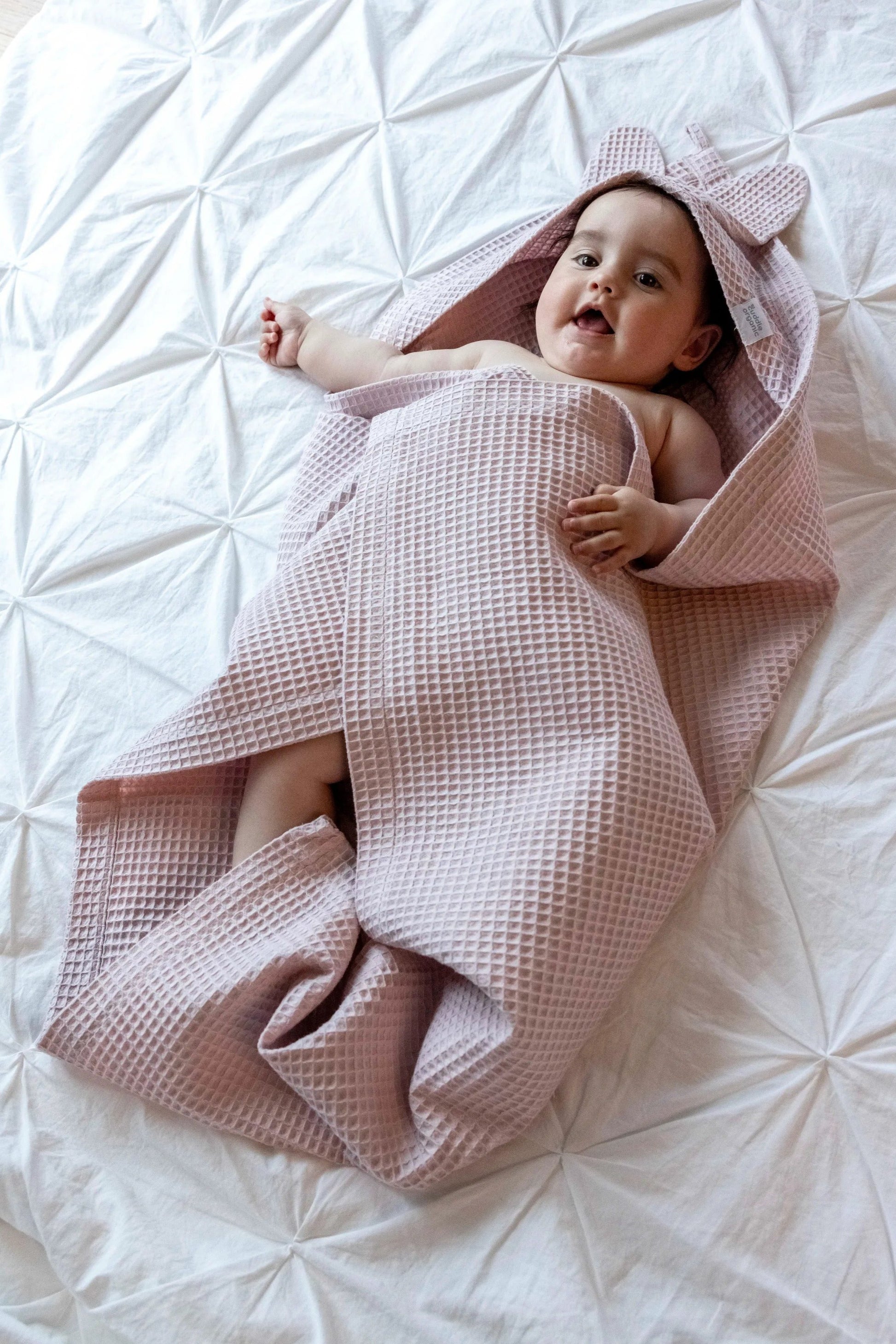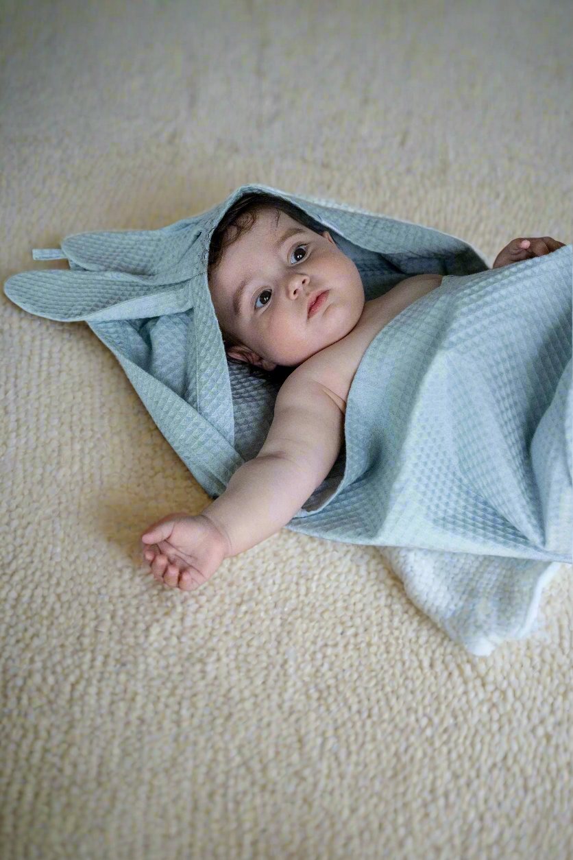Crafted with care from 100% organic waffle weave cotton, this generously sized towel is perfect for after bath time or a swim. The fabric is lightweight, absorbent and fast-drying, and maintains these properties even after frequent washing. The towel packs small for on-the-go use. The hood keeps little heads warm and the cute bunny ears add a touch of sweetness to everyday moments with your baby.