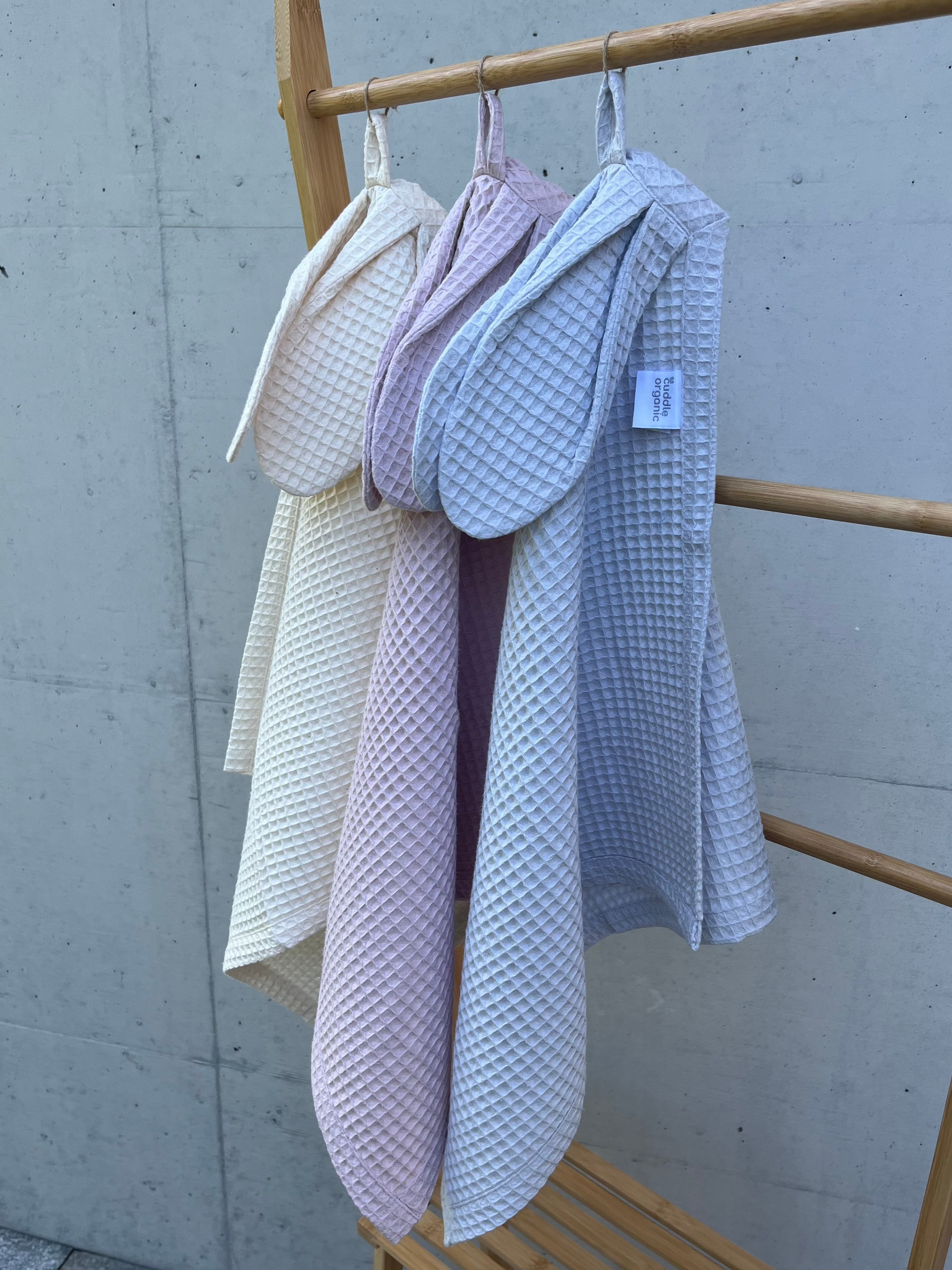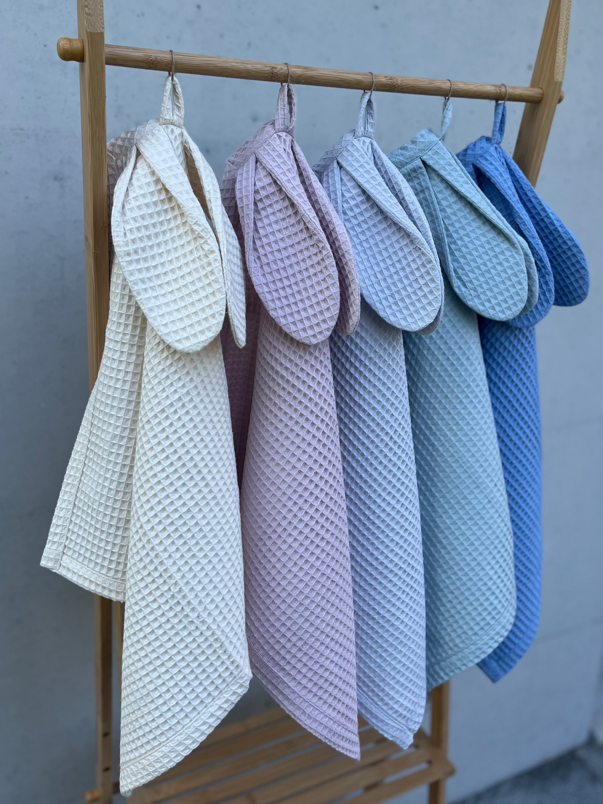 Crafted from 100% organic waffle weave cotton, this towel is incredibly gentle on little hands, turning everyday routines into delightful moments. The waffle fabric is practical thanks to its excellent absorption and quick drying properties. The playful bunny ears add a touch of whimsy that kids will adore, while parents can take comfort knowing it's made from OEKO-Tex certified organic cotton, free from harmful substances.